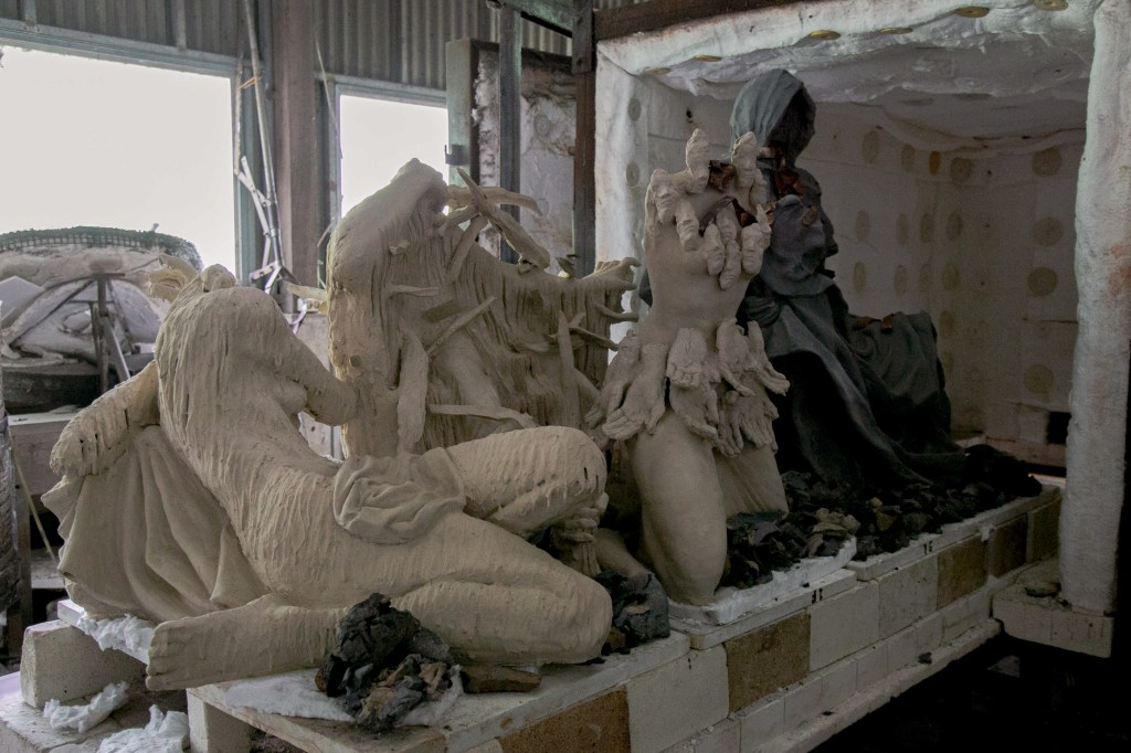 For Dzikra, once the work with clay reaches a certain point, the next phase is to surrender it to the kiln. In the encounter between hand and clay, what takes place is not only shaped by references drawn from the history or other narratives, but also by the clay itself. The contact between body and clay can become deeply intimate. And after such intimacy, there is a moment at which she must let go. The firing process unfolds under conditions that exceed her control. When the work returns from the kiln, carrying with it certain “surprises,” unexpected colours, the emergence of cracks, the material asserting itself. They belong to the behaviour of the material. Meanwhile, Louise’s print-making process, this time, places her in closer exposure to natural elements. The plaster casts are left open, carrying traces of soil, roots, small stones, and other matter that gathers there.