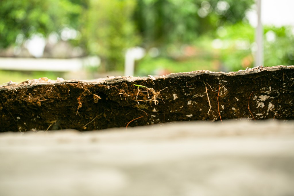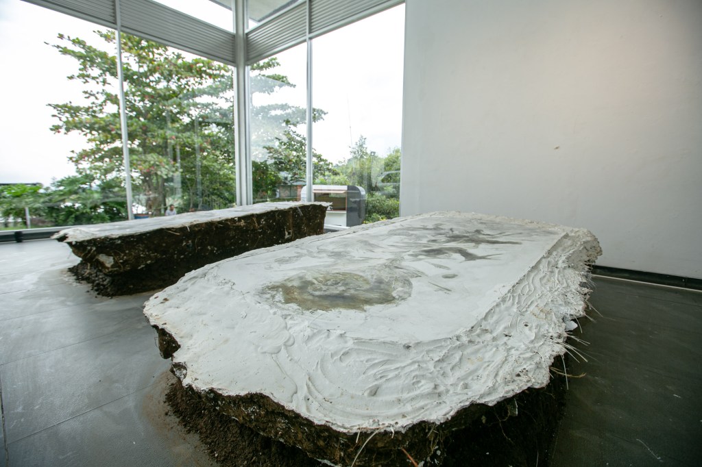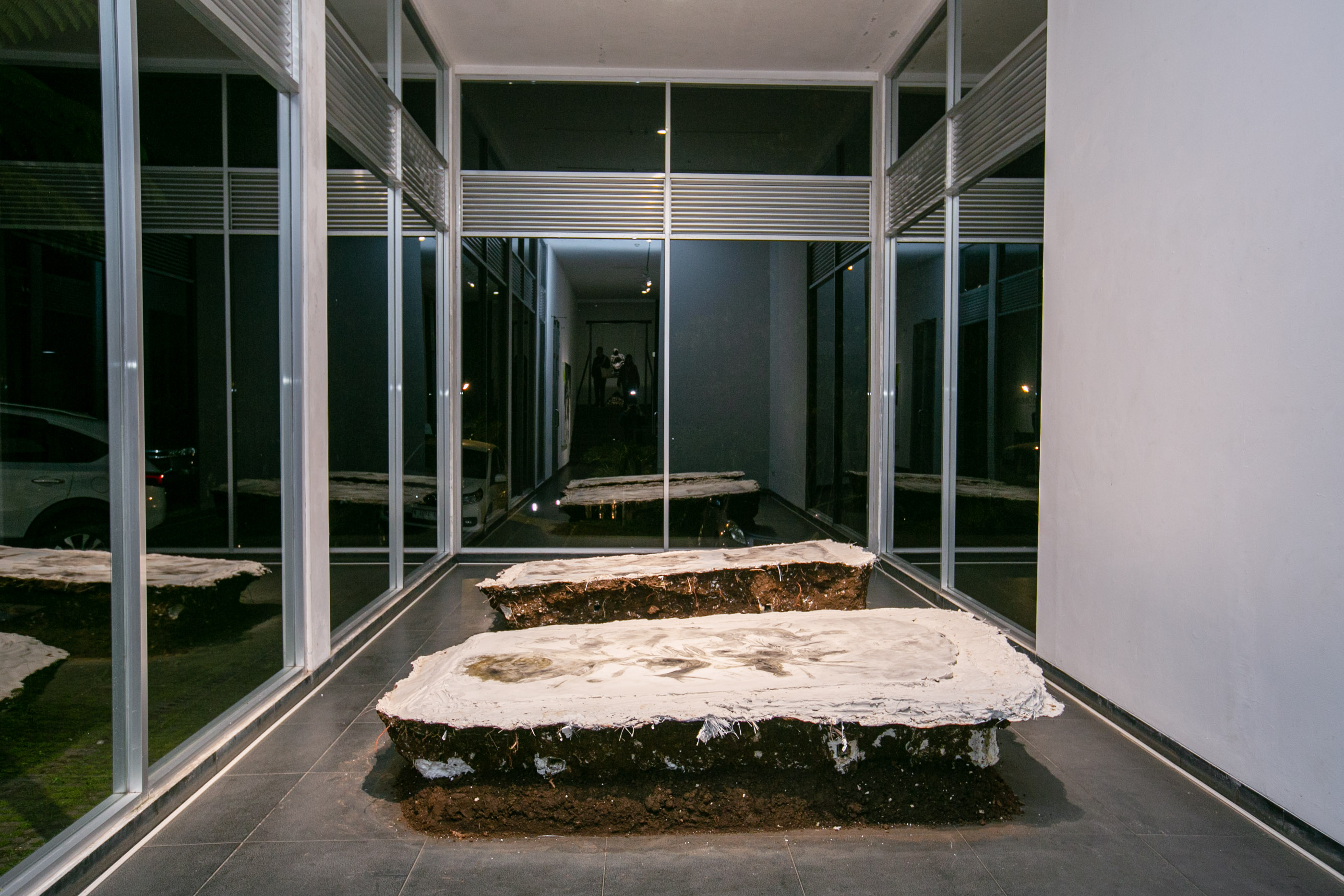 She began by digging into the ground of her yard. This time, she was working with a large plate, a full sheet of copper measuring 1,2 by 2,4 metres, and so required a correspondingly large plaster surface. The plaster was cast directly into the hollowed earth, and the plate placed across its upper surface. Working in this way, she found herself having to account for the elements, temperature, humidity, and the like. The move from East to North Bandung, she notes, has also affected the behaviour of the plaster. Since living in the north, she has come to realise that there are no plaster craftsmen in that area. She understands this as something shaped by natural conditions, above all humidity.